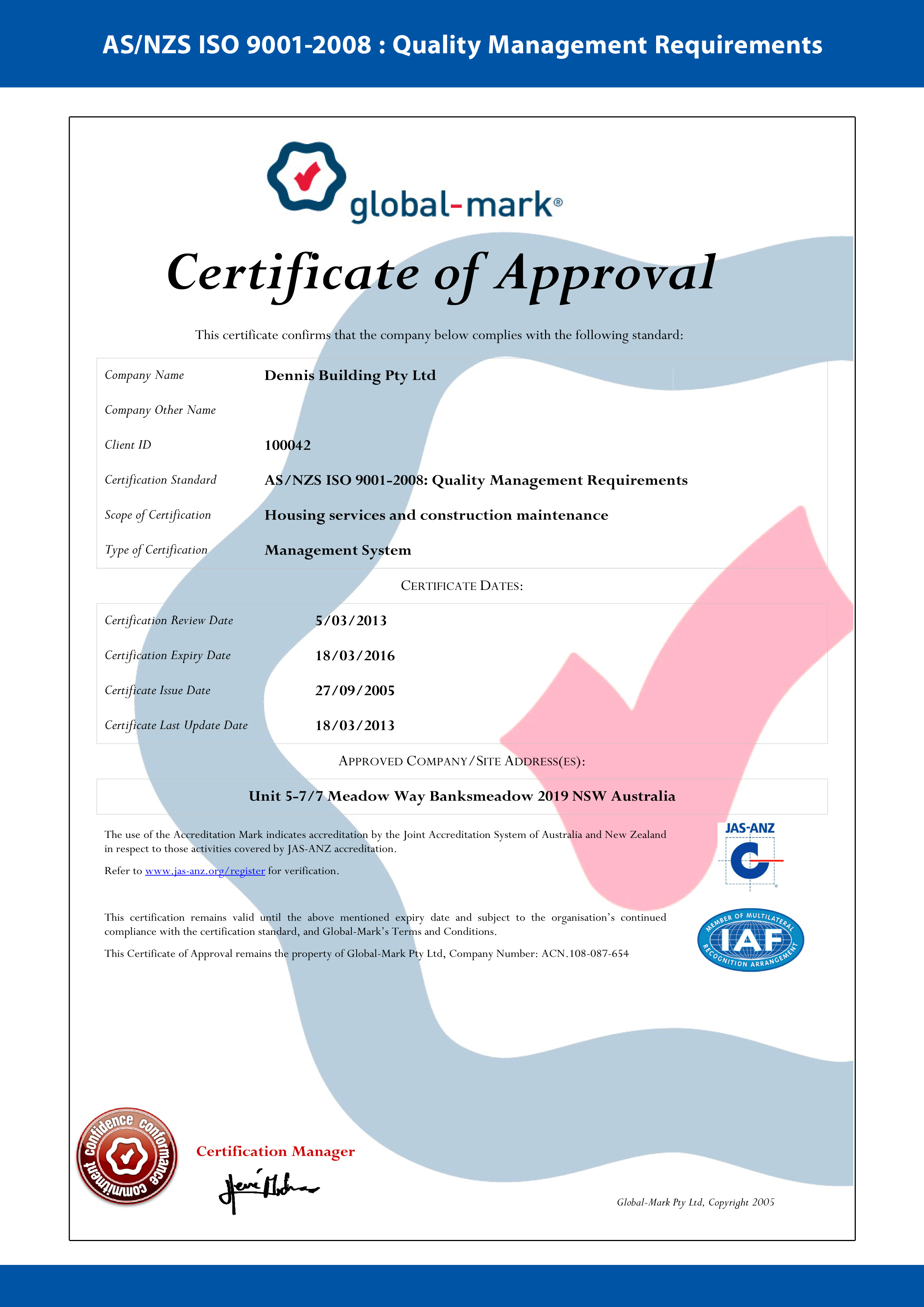Dennis Building Pty Limited committed to maintaining excellence in Occupational Health and Safety and Environmental