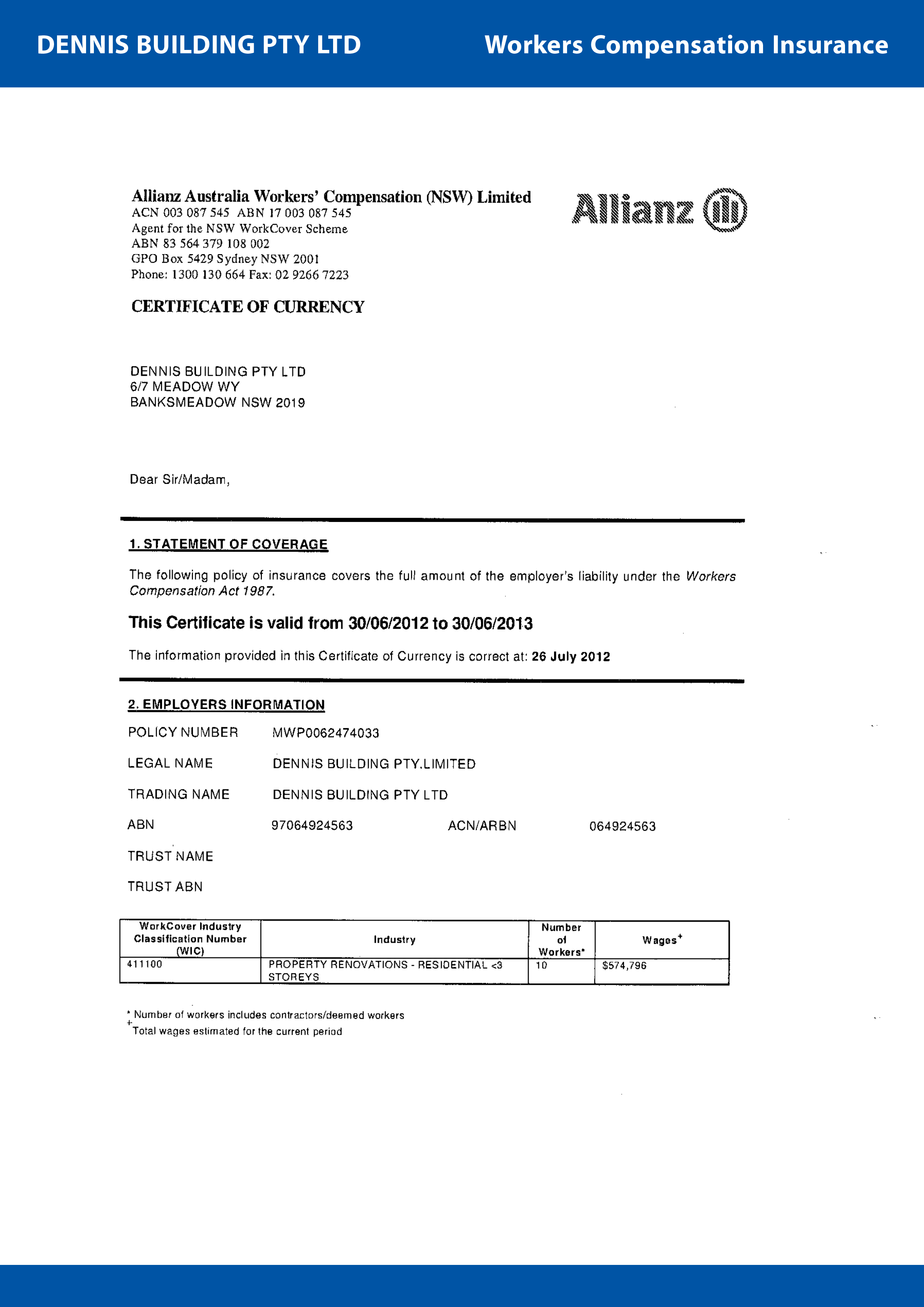 All of our works are covered by Public Liability Insurance through GIO General Limited (Policy No. SB1139250). Our employees are also covered by Workers Compensation Insurance through Allianz Australia Workers' Compensation(NSW) Limited (Policy No. MWP0062474033):